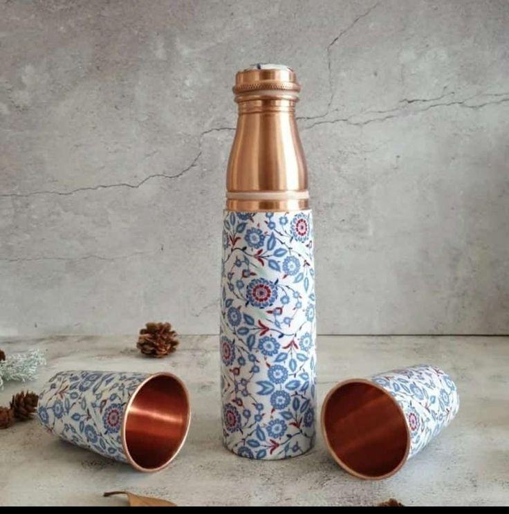 ขวดน้ำโลหะทองแดงบริสุทธิ์จากอินเดียถ้วยเซรามิกพิมพ์ลายออกแบบได้ตามที่ต้องการ