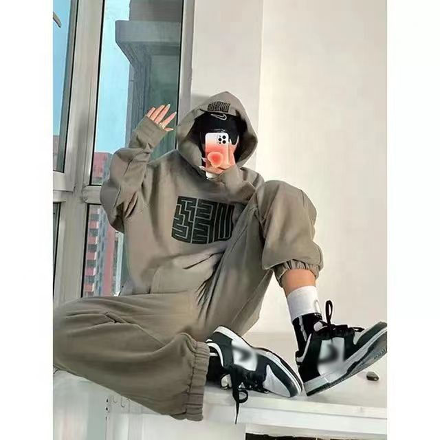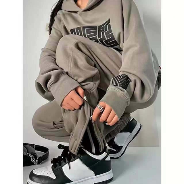 ชุดเซ็ตฮิปฮอปสองชิ้นสำหรับผู้หญิง คุณภาพดีที่สุด เสื้อฮู้ดและกางเกงขายาว แต่งลาย พร้อมดีไซน์ถักนิตติ้ง