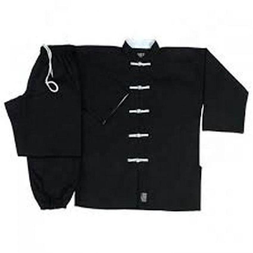 ชุดกังฟูสีดำคุณภาพดีที่สุด พร้อมปุ่มสีแดง ออกแบบโลโก้และดีไซน์ตามสั่ง ชุดกังฟูจีนโบราณ ผลิตโดย Zevron Sports