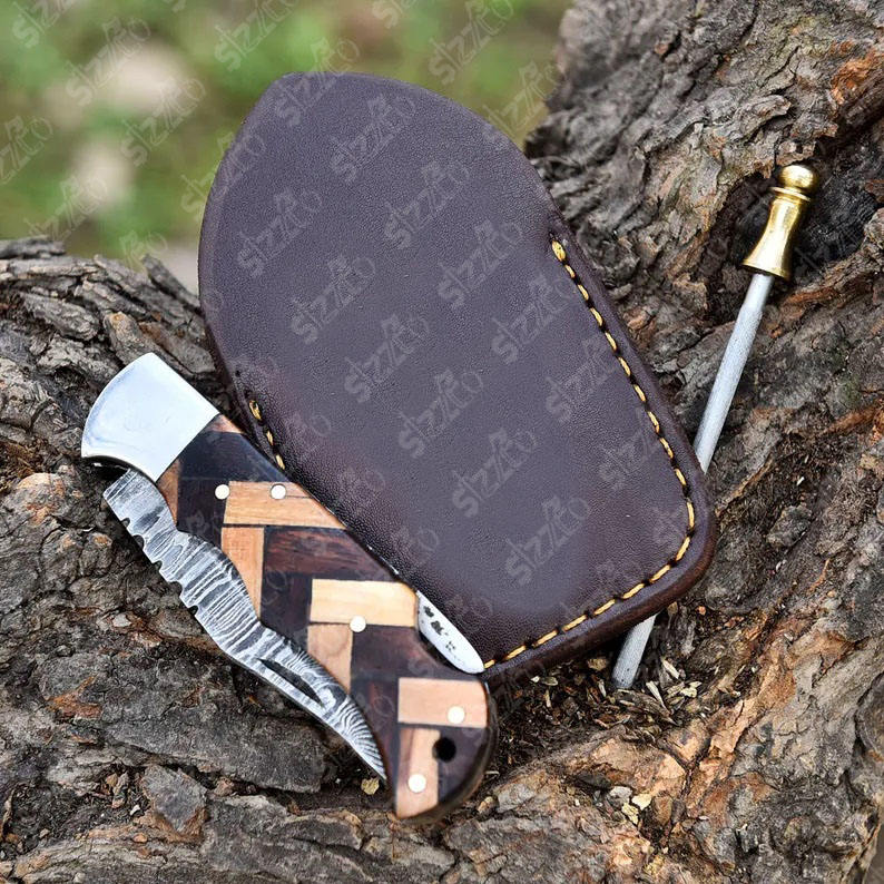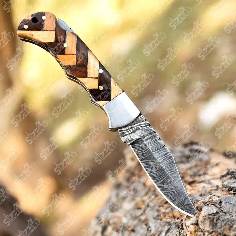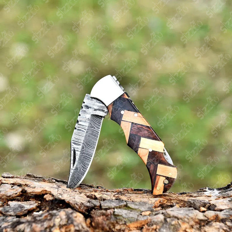 มีดพับดามัสกัสพร้อมด้ามไม้มีดพับสั่งทำได้สวยงาม OEM ชื่อโลโก้ของขวัญสำหรับผู้ชาย