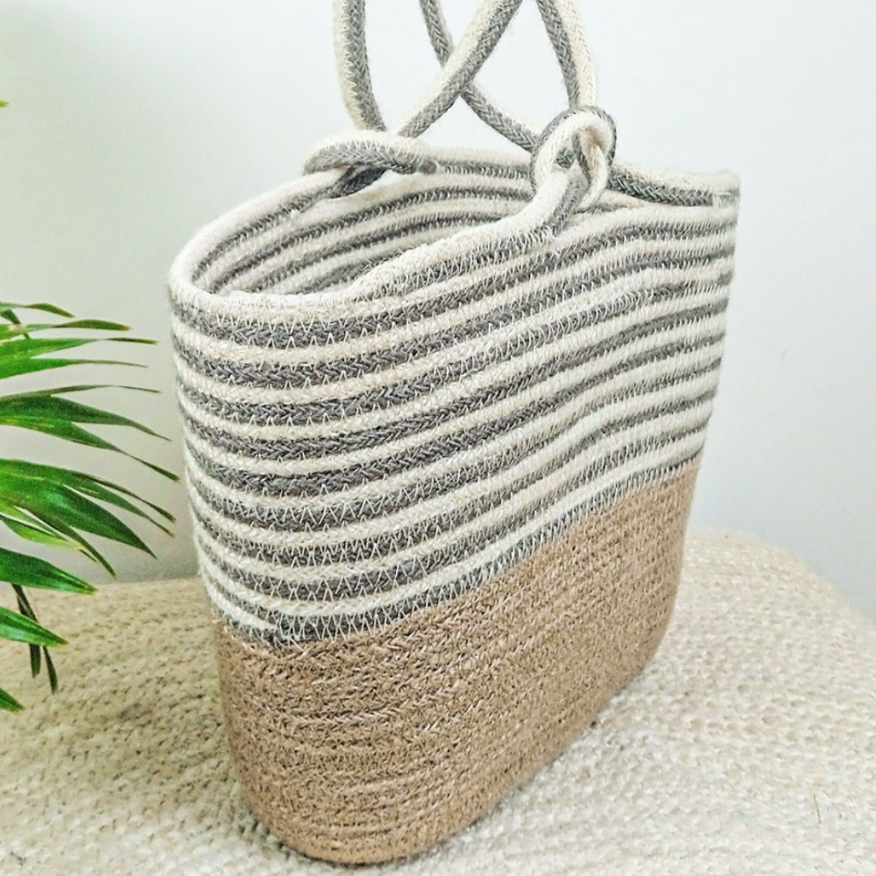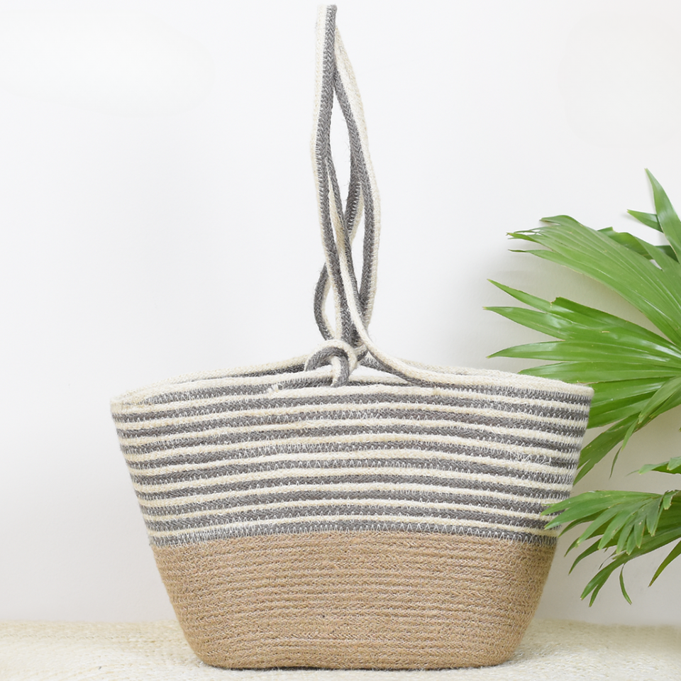 กระเป๋าโท้ทผ้าปอกระเจาคุณภาพดีที่สุด เป็นมิตรกับสิ่งแวดล้อม ทำจากเส้นใยธรรมชาติ 100% ลายดอกไม้ พร้อมหูหิ้วเชือก สำหรับใช้ในบ้านอย่างยั่งยืน