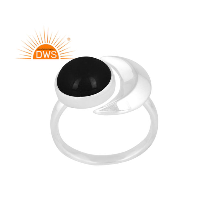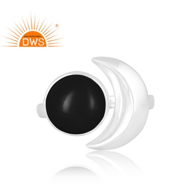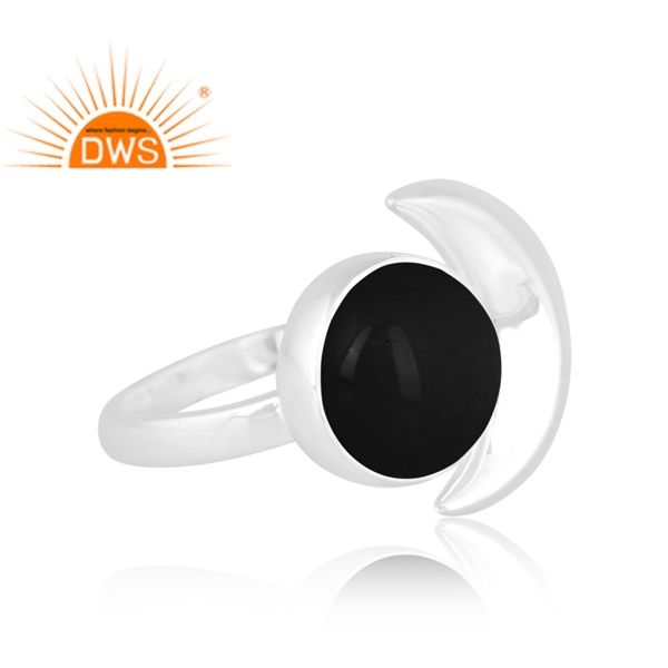 แหวนพลอยโอนิกซ์สีดำธรรมชาติแหวนปรับได้ดีไซน์รูปพระจันทร์เสี้ยวสีเงินแท้ปรับได้