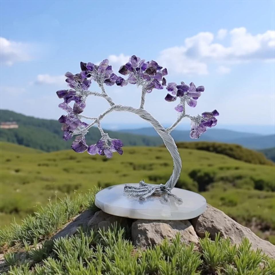 ต้นไม้คริสตัลอเมทิสต์ทำมือคุณภาพดีที่สุดบนฐานแผ่นอาเกตธรรมชาติ ของตกแต่งบอนไซตามหลักฮวงจุ้ย ของขวัญ