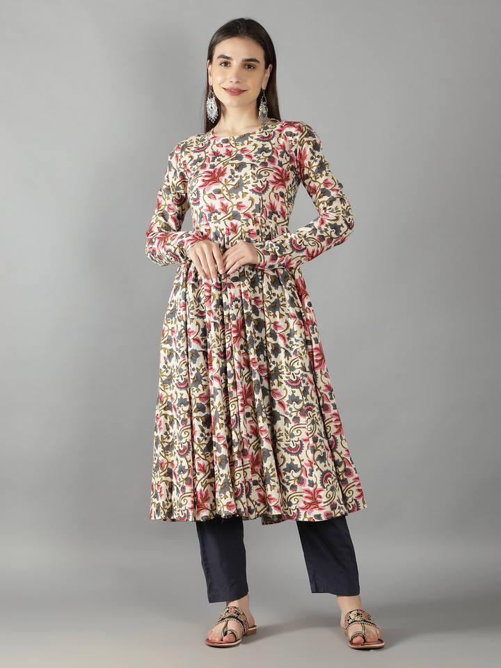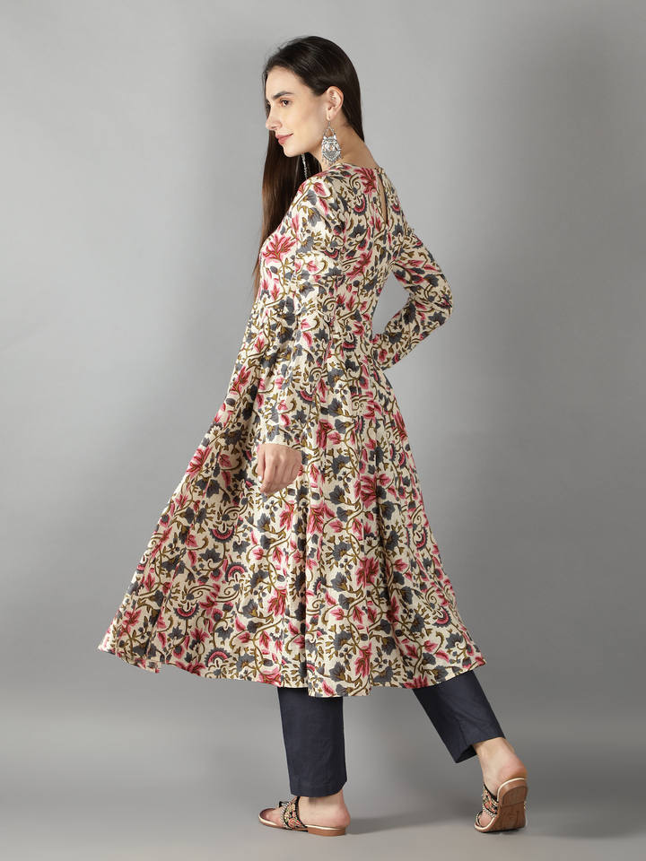 ชื่อผลิตภัณฑ์:ชุด anarkali พิมพ์ลายดอกไม้สีงาช้างคู่กับสีฟ้า pansy dupatta
