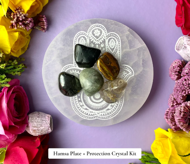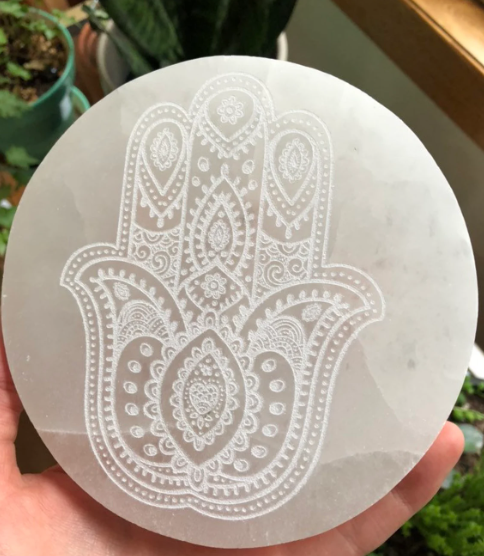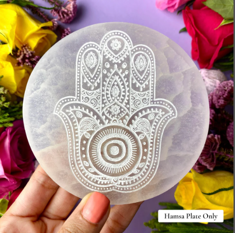 แผ่นชาร์จแบบ selenite สำหรับเป็นของขวัญที่ดีที่สุดแผ่นคริสตัลธรรมชาติ Ahoy 4 "Hamsa แกะสลักด้วยมือ