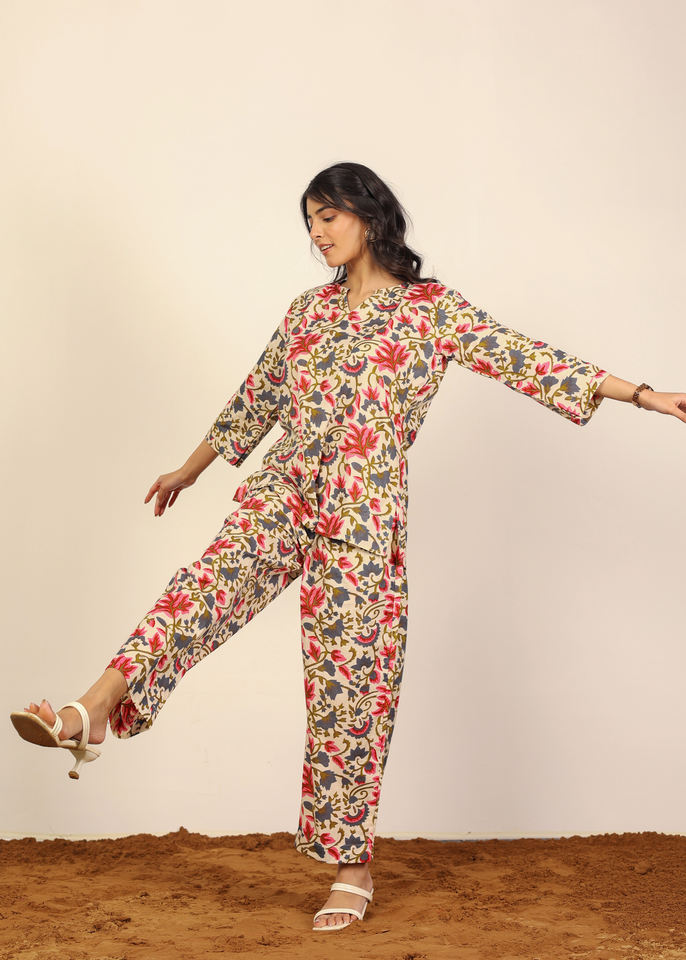 ชุดสองชิ้นเสื้อท่อนบนคอวีและกางเกงทรงตรงผ้าฝ้าย100% พิมพ์ลายดอกไม้หลากสีอินเดีย