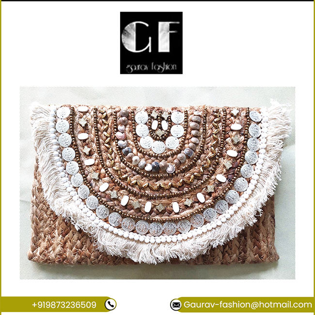 กระเป๋าคลัทช์ทำมือทำจากปอกระเจาประดับด้วยลูกปัดพู่ขนาดกลางจากอินเดียสำหรับผู้หญิงแฟชั่นพร้อมส่งจากอินเดีย