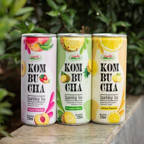 เครื่องดื่มคอมบูชาคุณภาพดีที่สุด ชาสลิมแบบมีฟอง ขนาด 250 มล. บรรจุกระป๋อง ผู้ผลิตเครื่องดื่มคุณภาพสูง รับผลิตแบบ OEM/ODM มีตัวอย่างให้ทดลองฟรี