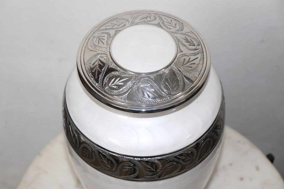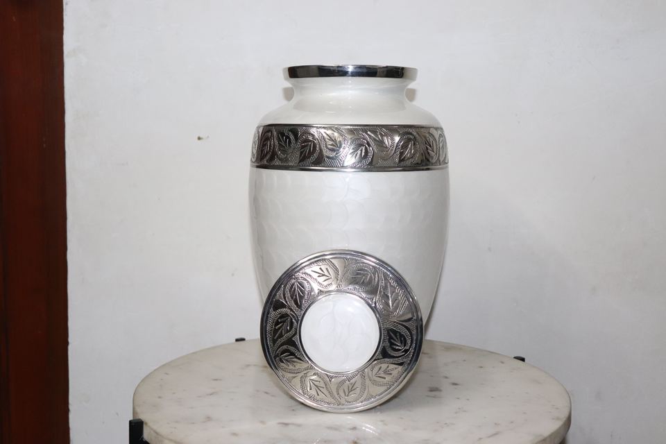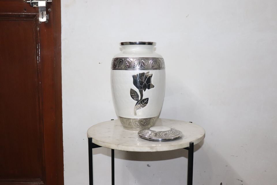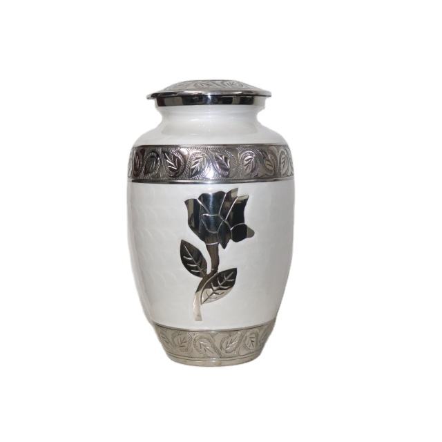 โกศเพลิงศพโลหะอลูมิเนียมขนาดใหญ่คุณภาพดีที่สุดมุกสีขาวพร้อมแกะสลักกุหลาบสีเงินรุ่น CU1 สําหรับผู้ใหญ่