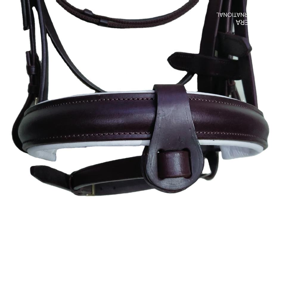 สายหนังคาดคิ้วเป็นรูปตัววีสำหรับบังเหียนม้าสายพานหนังพร้อมแผ่นรองจมูกแบบข้อเหวี่ยงและสายรั้งเว็บแฟลชสำหรับแข่งขี่ม้า