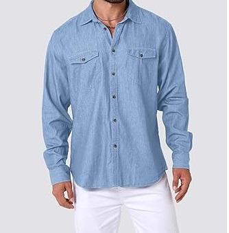 เสื้อยีนส์ผู้ชายน้ำหนักเบาเข้ารูปสีฟ้าปกติระบายอากาศได้ดีดีไซน์ยอดนิยมแขนยาวติดกระดุมปิด