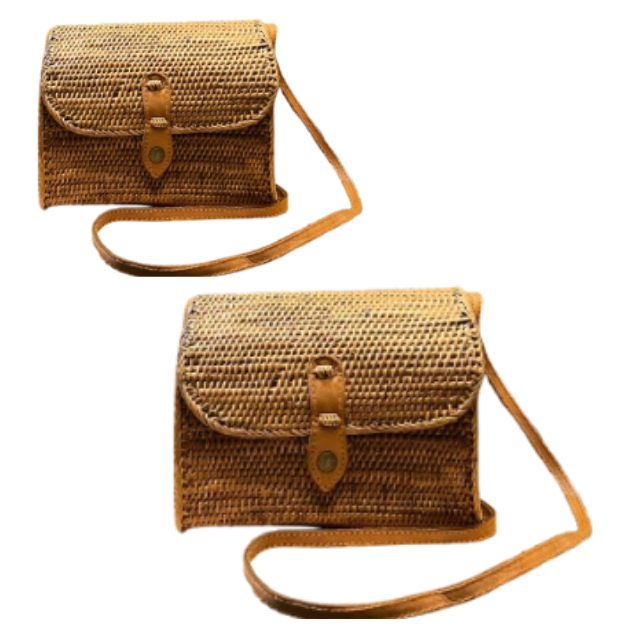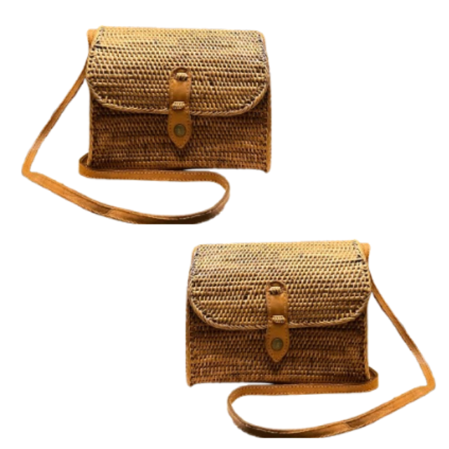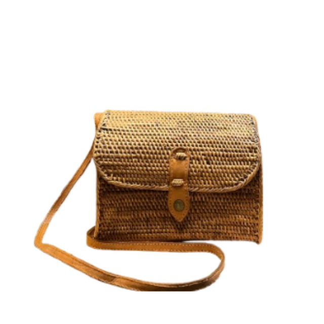 Lombok กระเป๋าสตางค์หวายสานด้วยมือคลาสสิก, กระเป๋าคาดลำตัวมีฝาปิดหนังและกระดุมทองเหลืองงานหัตถกรรมเครื่องจักสาน