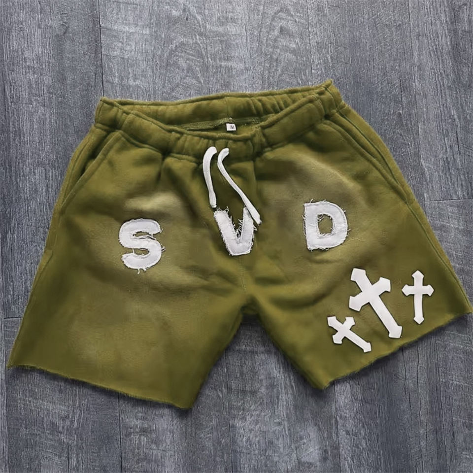 กางเกงขาสั้นกันเหงื่อผ้าฝรั่งเศสสำหรับผู้ชายกางเกงขาสั้นกันเหงื่อผ้าเกล็ดปลาแบบสตรีทแวร์ฟอกสีซีดซีดแสงแดดดีไซน์วินเทจฟิตเนส