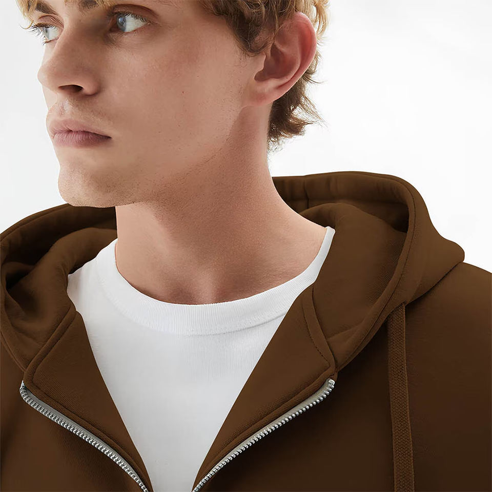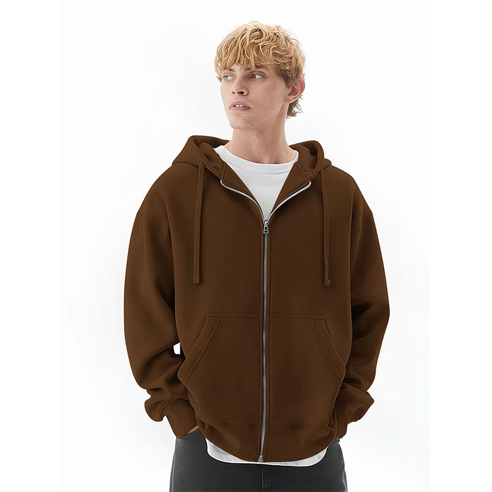เสื้อฮู้ดผู้ชายสีน้ำตาลเข้มมีซิปเปิดไหล่แขนยาวไซส์ใหญ่พิเศษมีกระเป๋าข้าง