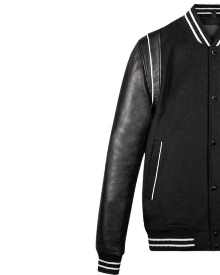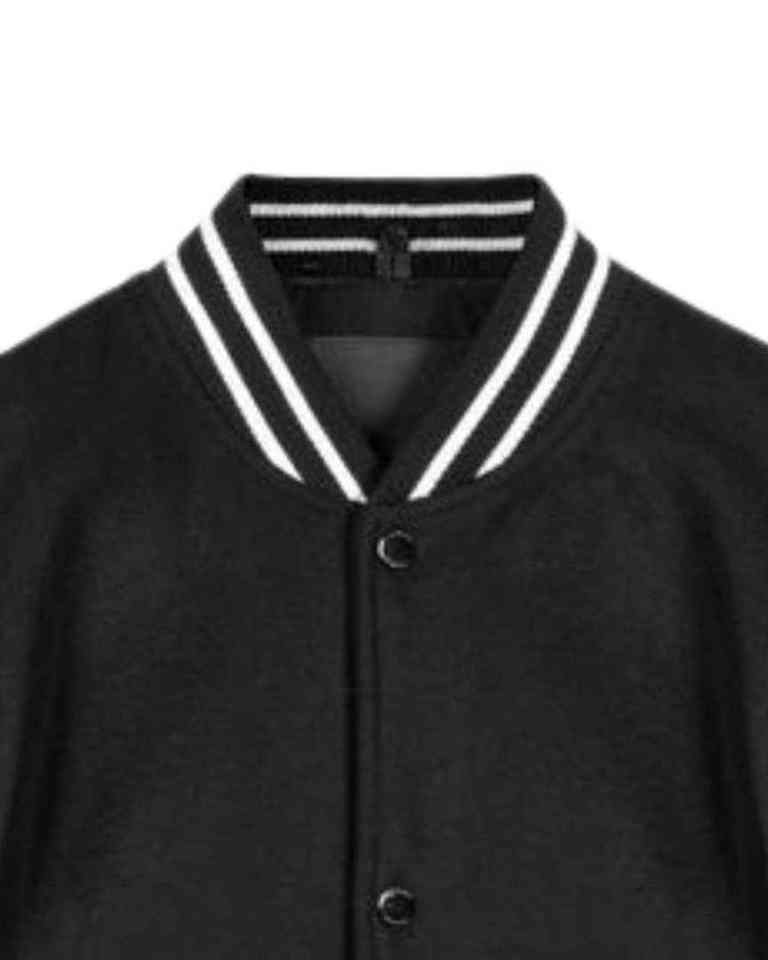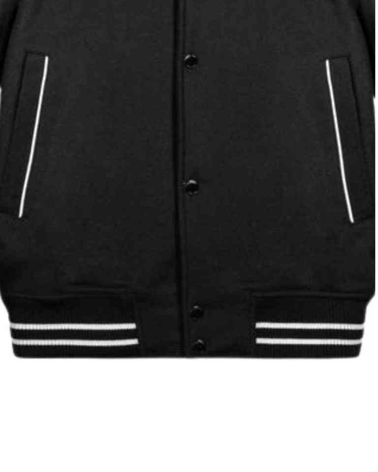 แจ็คเก็ตวาร์ซิตี้ชายคุณภาพดีที่สุด ตัวเสื้อทำจากผ้าขนสัตว์สีดำ แขนหนังสีดำ คอเสื้อแบบริบแถบสีขาว แจ็คเก็ตบอมเบอร์สไตล์วิทยาลัย มีจำหน่ายแล้ว