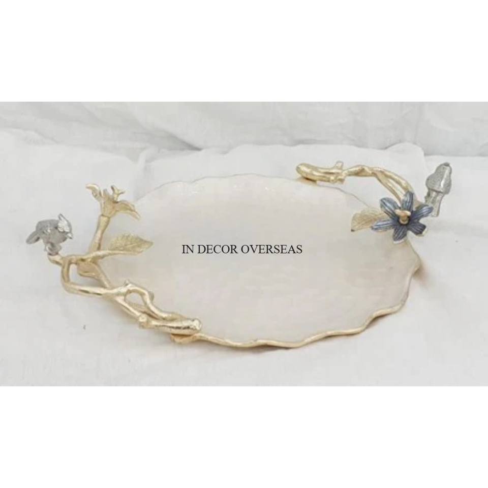ชามเคลือบผงสีขาวและชุบทอง3ช่องทำจากโลหะมีใบไม้และดอกไม้ดีไซน์รูปนก