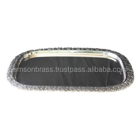 ถาดเสิร์ฟอาหารทรงสี่เหลี่ยมผืนผ้าพร้อมการออกแบบที่สวยงามบนเส้นขอบถาดโลหะสำหรับห้องครัวของโรงแรม