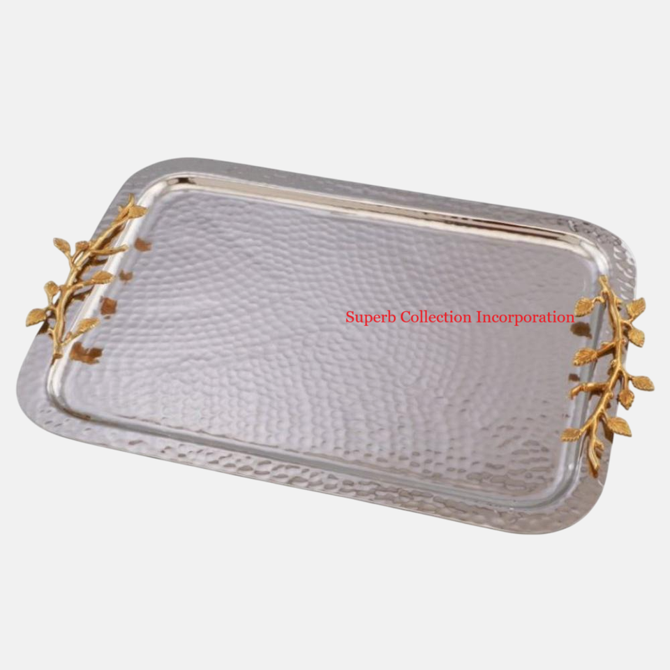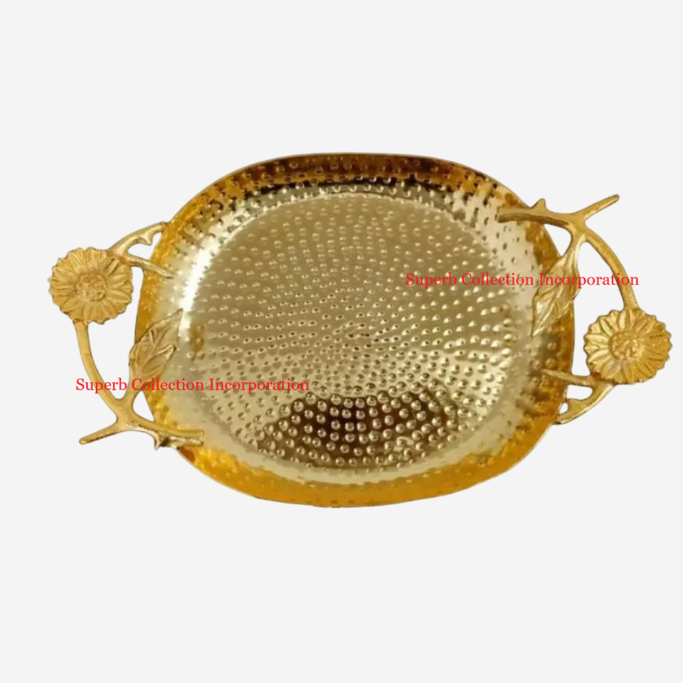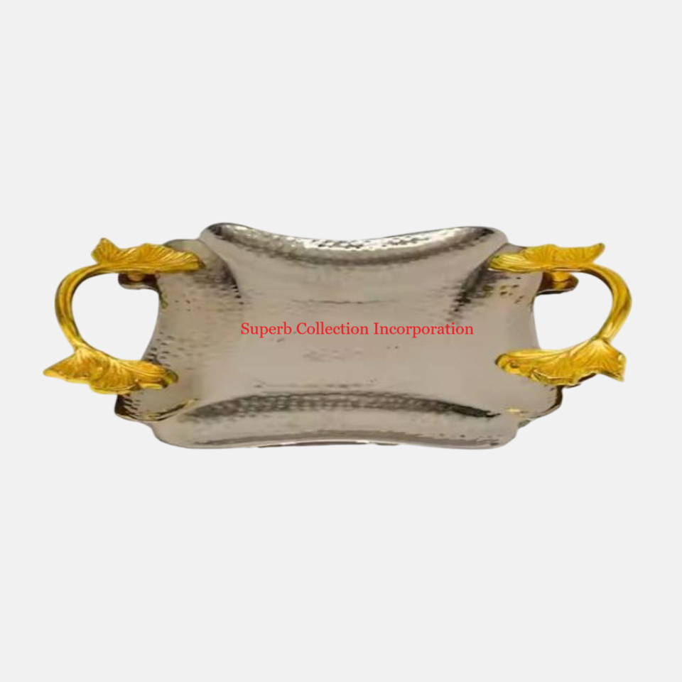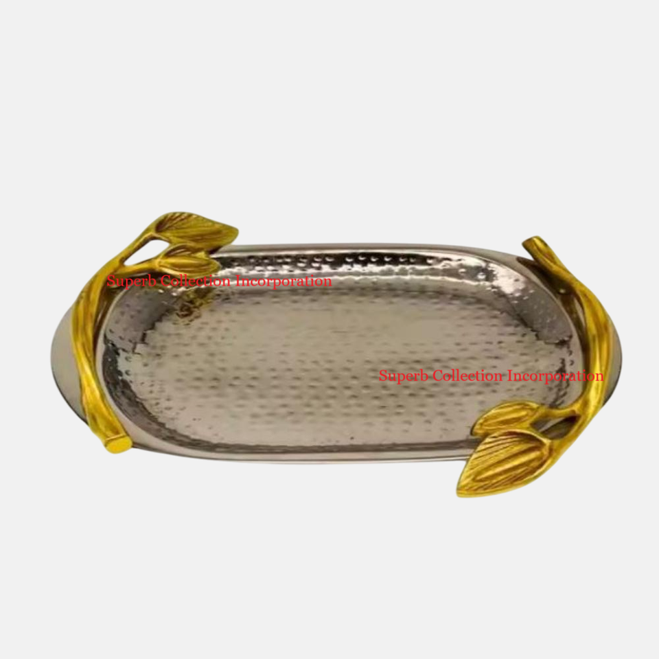 ถาดโลหะพร้อมด้ามจับดีไซน์รูปใบไม้ถาดเสิร์ฟขนมอาหารดีไซน์แฟนซีสำหรับตกแต่งโต๊ะ