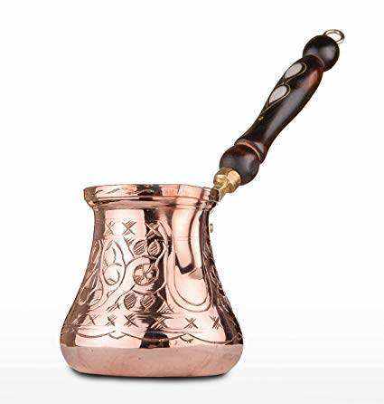 กาน้ำชาและกาแฟแบบตุรกีทำด้วยมือขนาดเล็กกาน้ำชาเคลือบทองแดงตกแต่งโต๊ะ