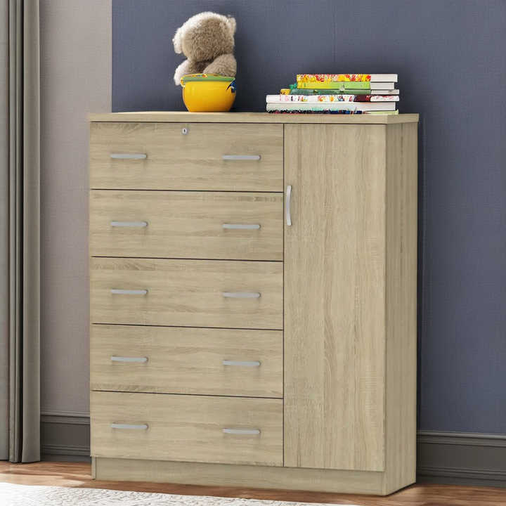 ตู้ลิ้นชัก5ลิ้นชักอเนกประสงค์1ประตูสำหรับห้องนอนห้องนั่งเล่นตู้ทำจากไม้มาเลเซียสำหรับเด็ก