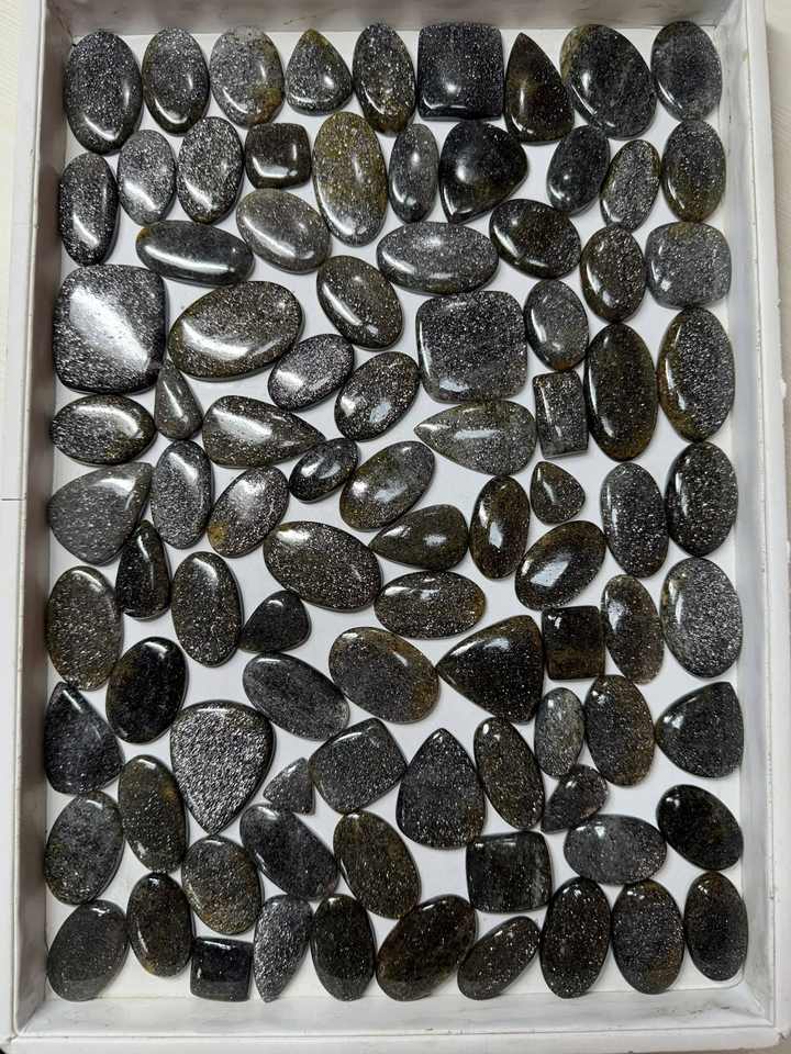 พลอยซันสโตนสีดำธรรมชาติคุณภาพดีที่สุด รูปทรงคาโบชอง แมกนีเซียคราฟท์คัท สำหรับทำเครื่องประดับเพื่อการบำบัด
