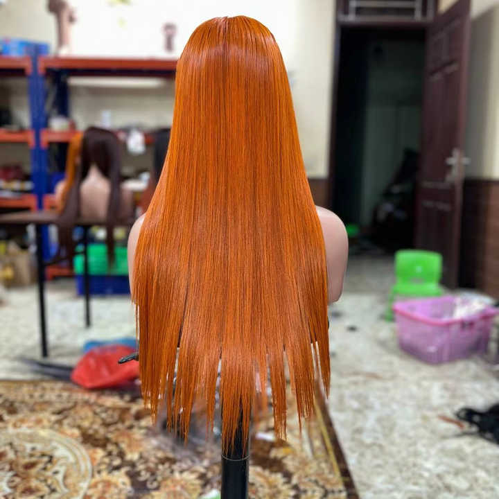 ช่อผมตรงกระดูกสีส้มพร้อมแผ่นปิดเพื่อทำวิกผมหน้าม้าจากผมจริง