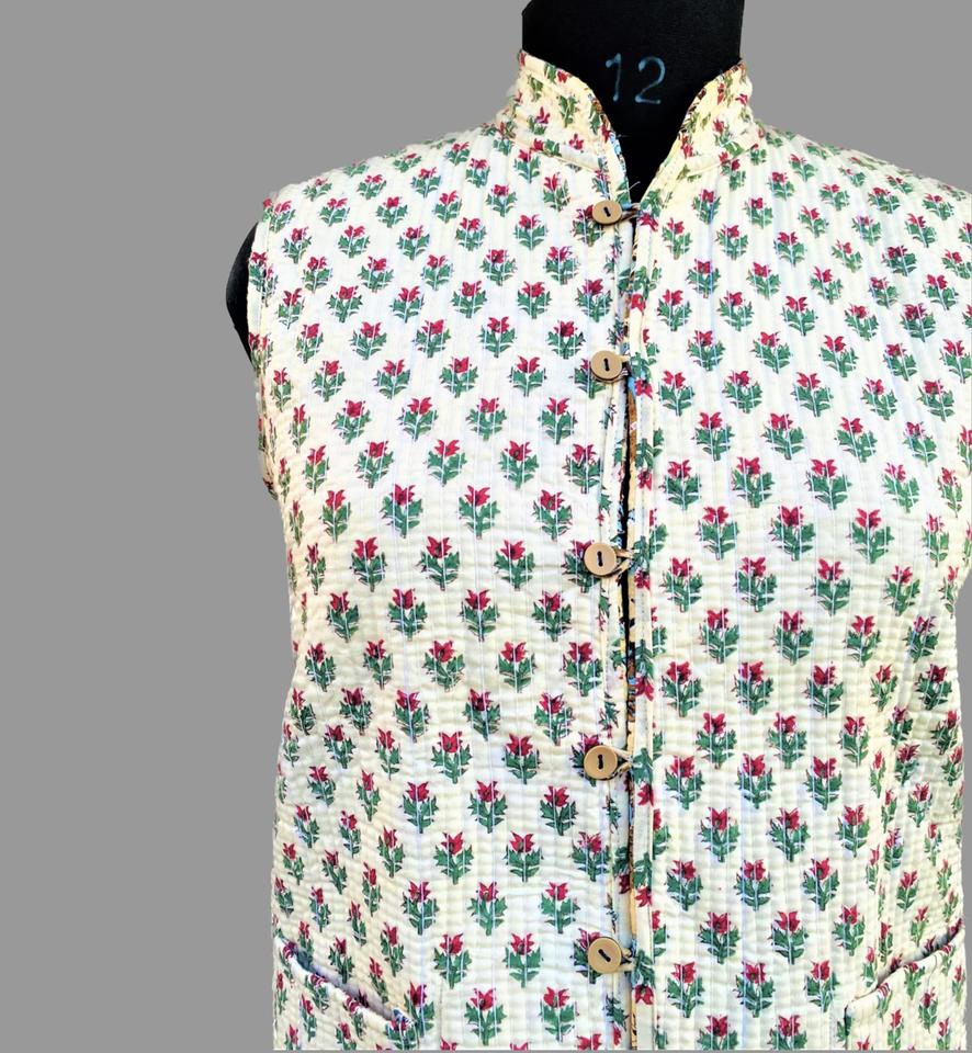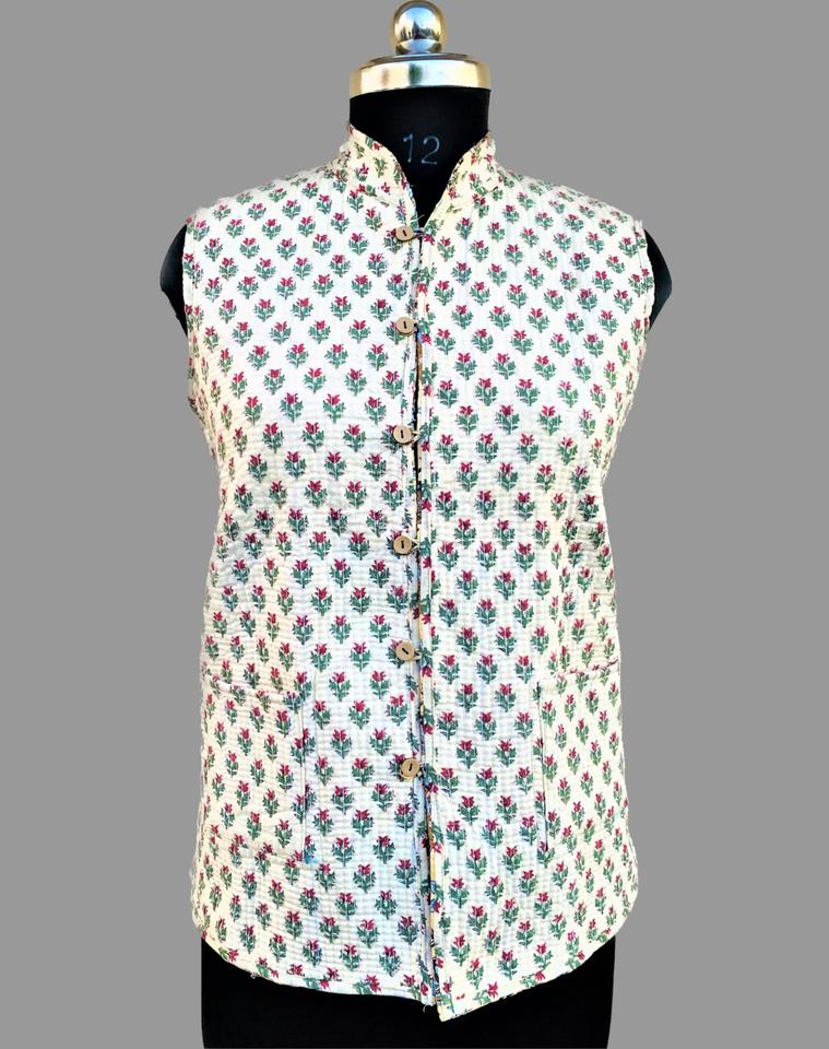 เสื้อกั๊กผ้าฝ้ายลายควิลท์แบบกลับด้านได้สำหรับผู้หญิงเสื้อโค้ททำด้วยมือพิมพ์ลายดอกไม้โบฮีเมียนชุดใส่ด้านนอกกันลม