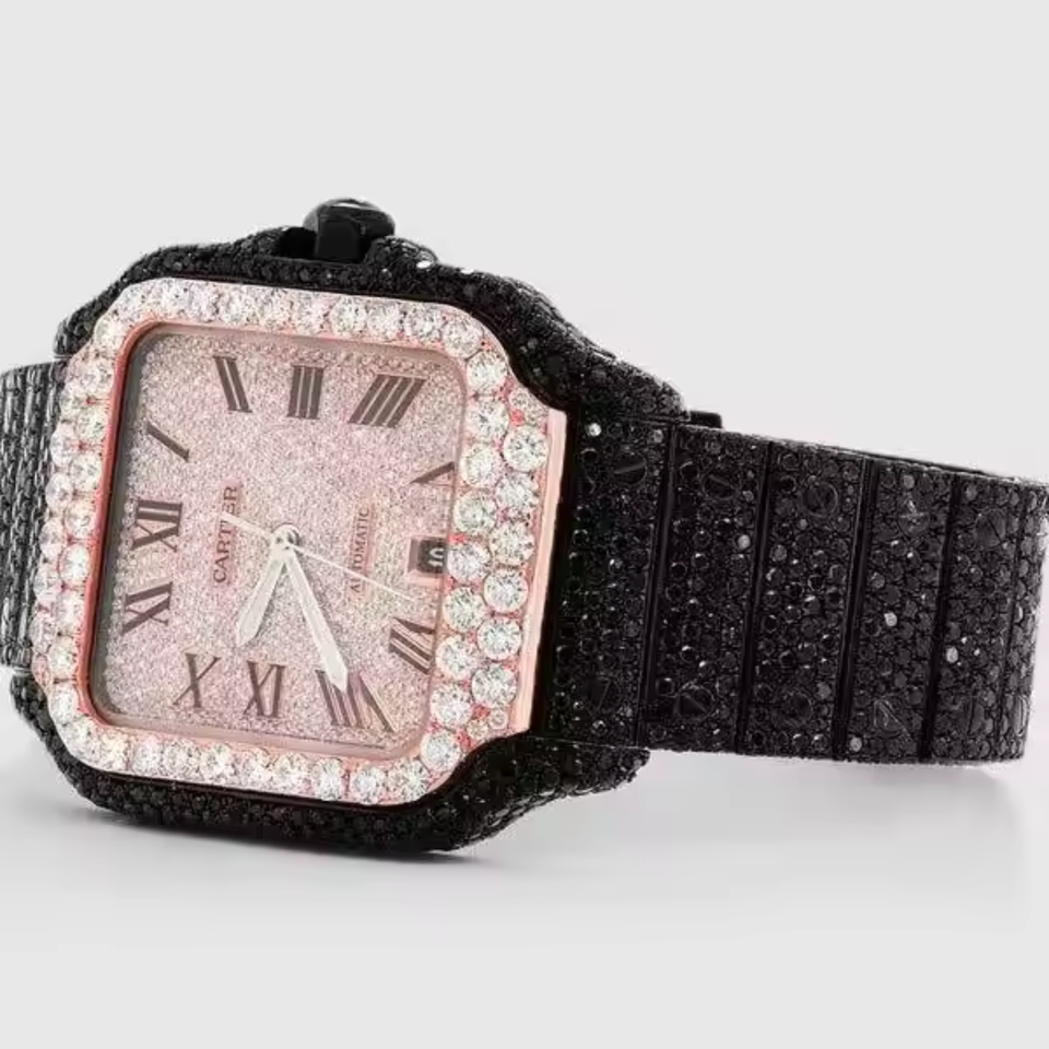 นาฬิกาควอทซ์สแตนเลสแฟชั่นสุดหรูสินค้าใหม่ประดับเพชรเย็นแบบอัตโนมัติสีดำหรูหราขอบสีโรสโกลด์