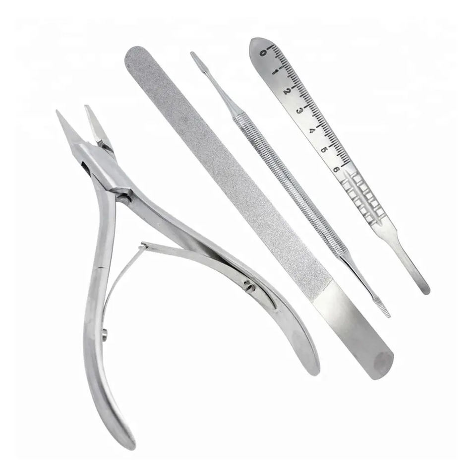 ชุดเครื่องมือทำเล็บเท้าคุณภาพดีเยี่ยม ระดับมืออาชีพ ทนทาน ทำจากสแตนเลส ประกอบด้วยที่ตัดเล็บขบ ด้ามมีดผ่าตัด และตะไบเล็บ 4 ชิ้น ปากกว้าง