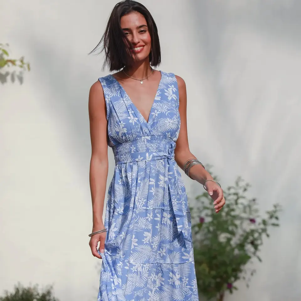 เดรสแมกซี่ยาวพิมพ์ลายสีฟ้าสำหรับผู้หญิงเดรสยาวคอวีแขนกุดยาวผ้าไอซ์ซิลค์ลำลองฤดูใบไม้ผลิ