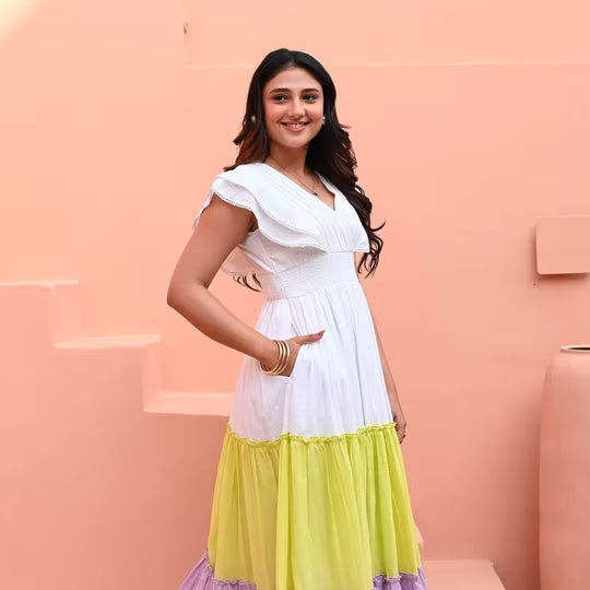 ชุดเดรสผ้าฝ้ายเป็นชั้นๆคอวีผ้าระบายระบายอากาศได้ดีเป็นมิตรกับสิ่งแวดล้อม