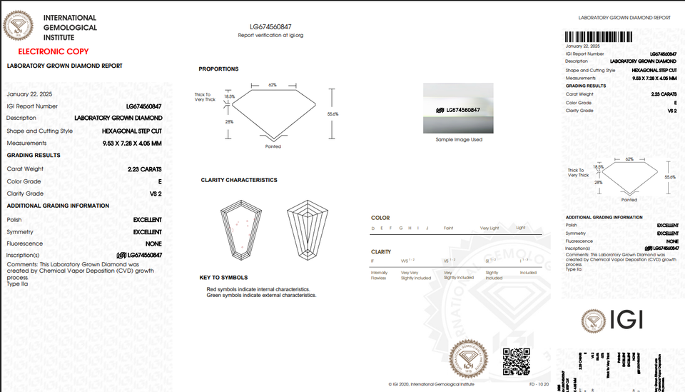 เพชรคุณภาพดีที่สุด VVS2 เพชรหลวมที่สร้างขึ้นในห้องปฏิบัติการ ได้รับการรับรองจาก IGI รูปทรงหกเหลี่ยม น้ำหนัก 2.23 กะรัต สี E เพชร CVD ที่ปลูกในห้องปฏิบัติการ RJ Diamond RJB-3-27