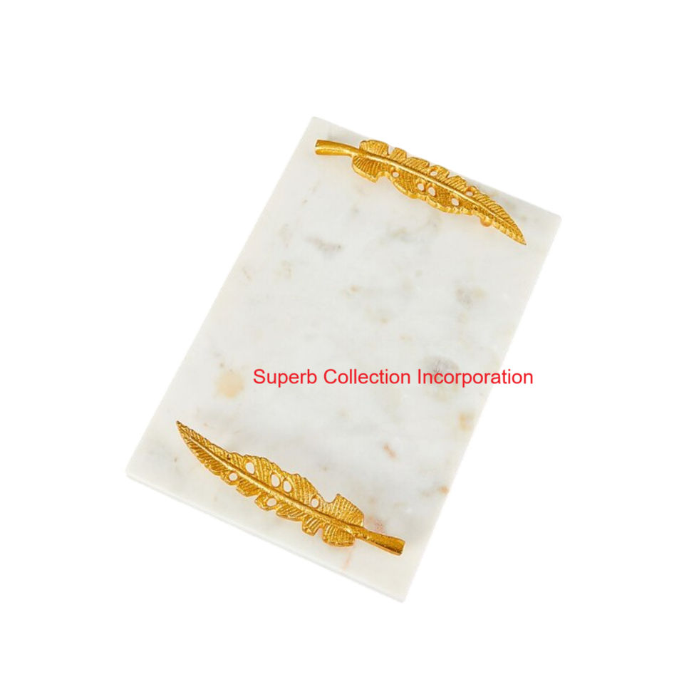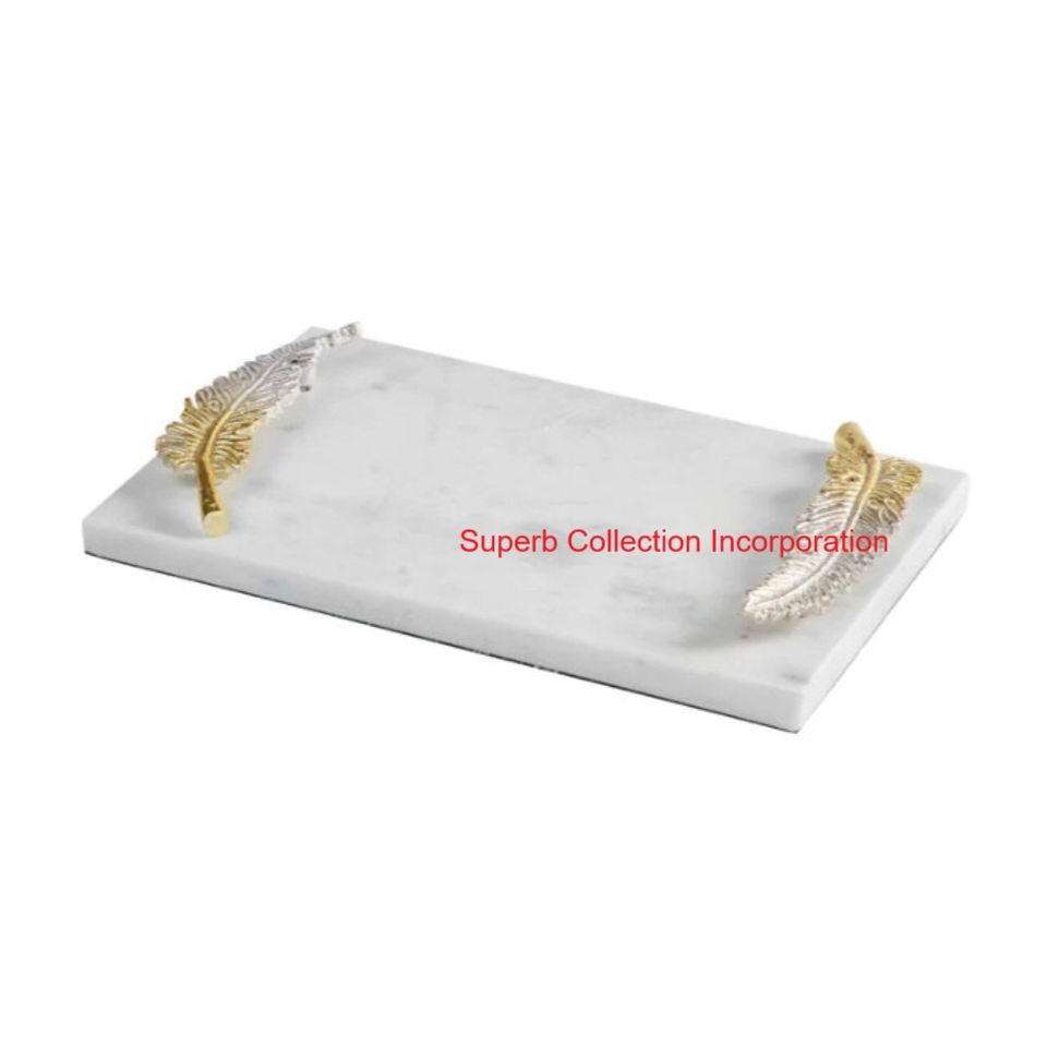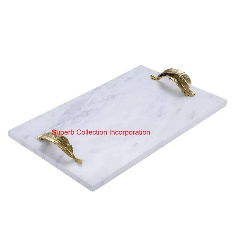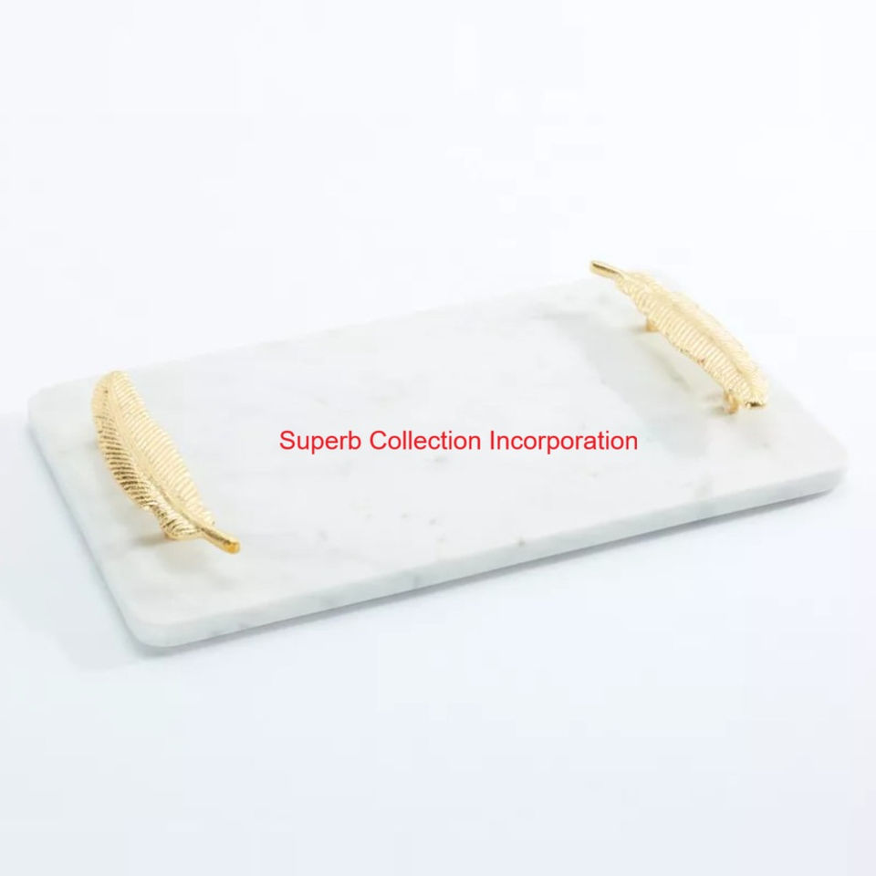 ถาดเสิร์ฟหินอ่อนสีขาวพร้อมด้ามจับโลหะรูปใบไม้สีทองหรูหราหินทำมือสำหรับตกแต่งบ้าน