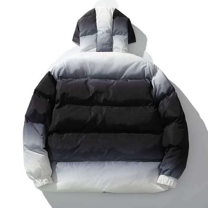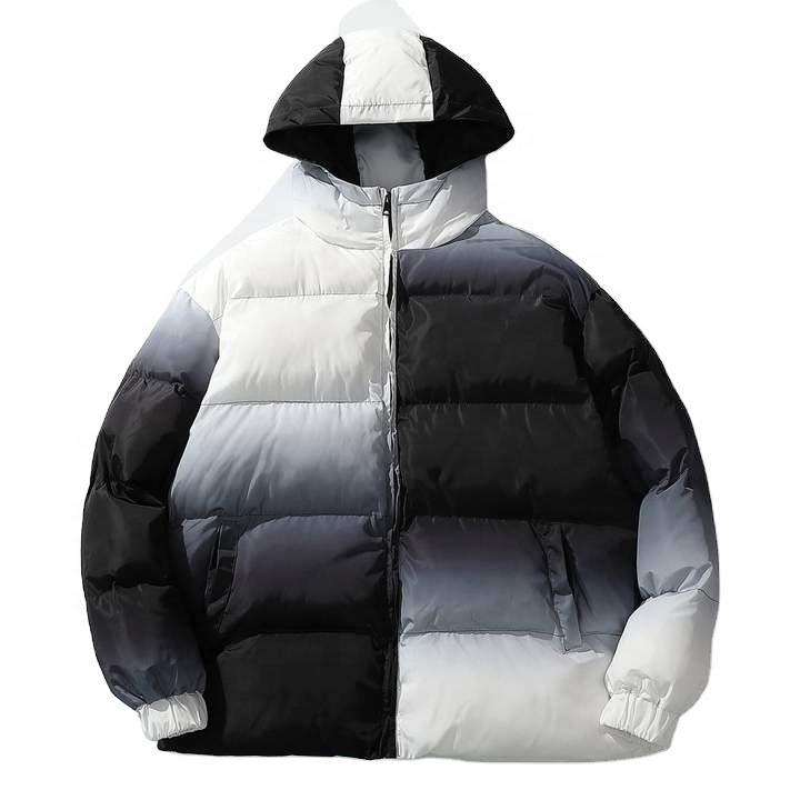 เสื้อแจ็คเก็ตทรงพองเคลือบฟองสำหรับผู้ชายกันลมกันน้ำมีขาตั้งพิมพ์ลายดิจิทัลสำหรับฤดูหนาว