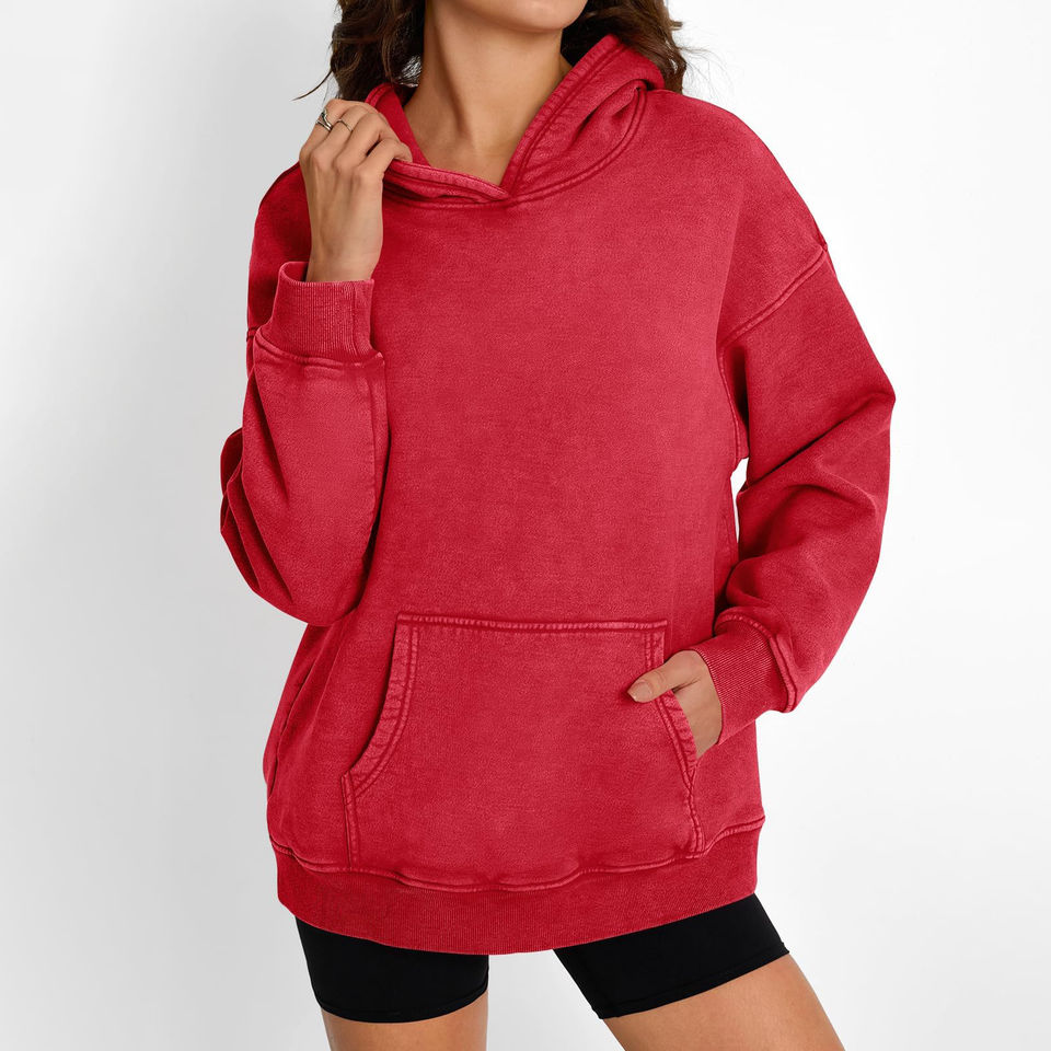 เสื้อฮู้ดผู้หญิงผ้าฟลีซบุซับในแบบวินเทจ ล้างสีแบบแอซิดวอช คุณภาพดีที่สุด ทรงโอเวอร์ไซส์ โลโก้สั่งทำด้านหน้า สีปรับแต่งได้