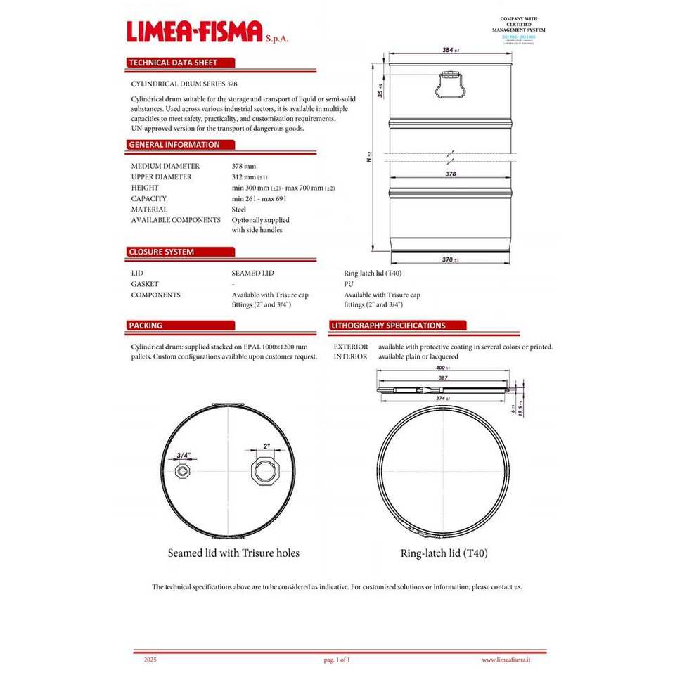 ถังเหล็กทรงกระบอกคุณภาพดีที่สุด เส้นผ่านศูนย์กลาง 378 มม. ปรับแต่งได้ พร้อมฝาปิดแบบตะเข็บ ความจุรวมตั้งแต่ 31 ถึง 70 ลิตร