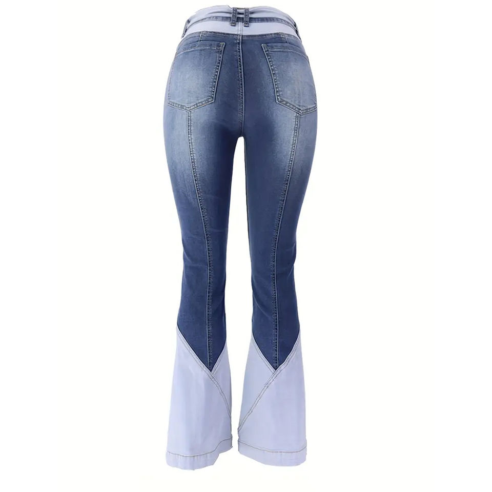 กางเกงยีนส์ทรงบล็อกสีเอวสูงทรงขาบานสำหรับผู้หญิง ขายส่ง กางเกงยีนส์ทรงขากระดิ่งผ้ายืดสูง มีกระเป๋าแบบเฉียงสำหรับผู้หญิง