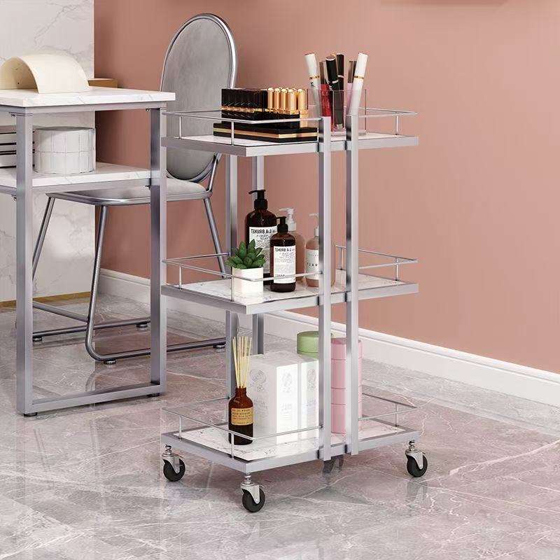 รถเข็นเสริมสวยหรูหราสีทองเงิน สำหรับงานทำเล็บ ต่อขนตา พร้อมชั้นวางเก็บอุปกรณ์โลหะเคลื่อนย้ายได้ เหมาะสำหรับใช้กับงานทำเล็บ ลดราคาสุดพิเศษ
