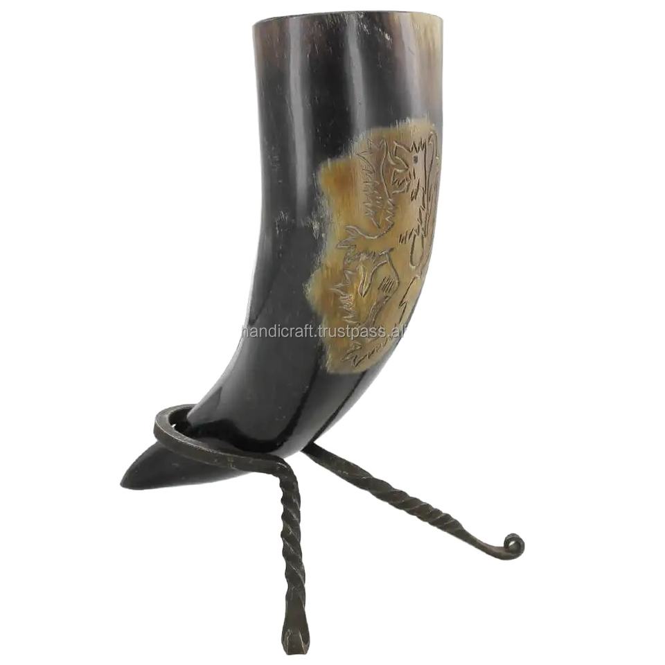 ถังเบียร์ขนาดใหญ่วินเทจสไตล์สัตว์ยุคกลางโบราณแตรดื่มธรรมชาติขาตั้งอาหารเครื่องดื่มขัดเงาปลอดภัย