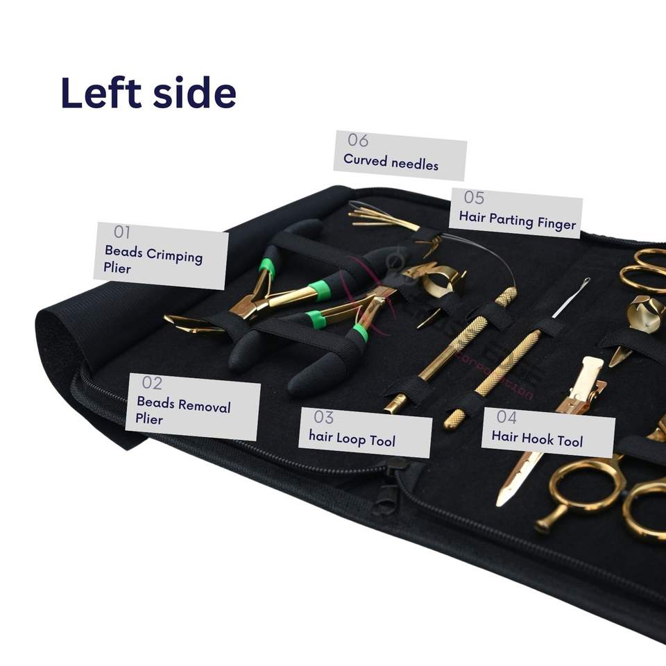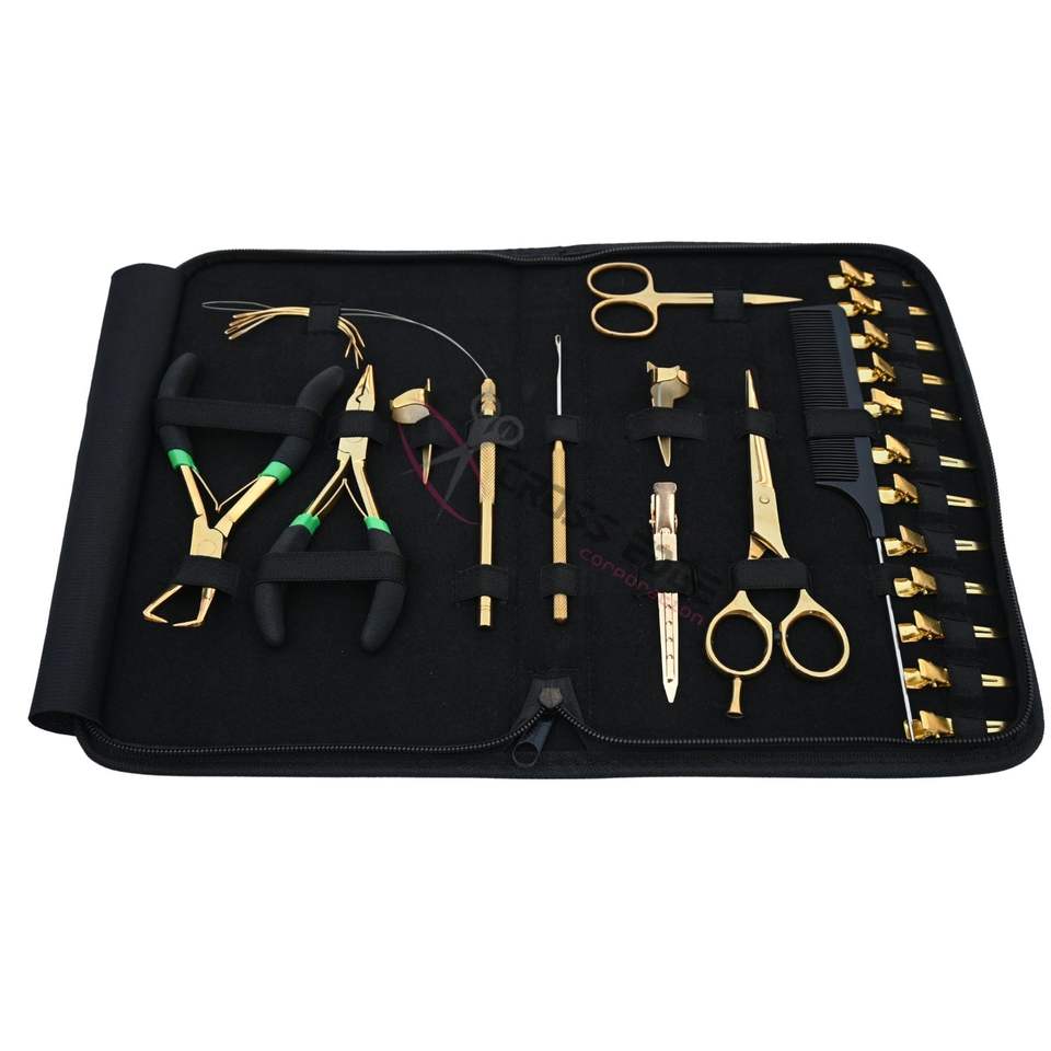 ชุดอุปกรณ์ต่อผมเบสท์ ซาลอน โกลด์ ประกอบด้วยคีมต่อผม กรรไกรตัดผม กิ๊บจัดแต่งทรงผม หวี กรรไกร และอุปกรณ์เสริมสำหรับต่อผม