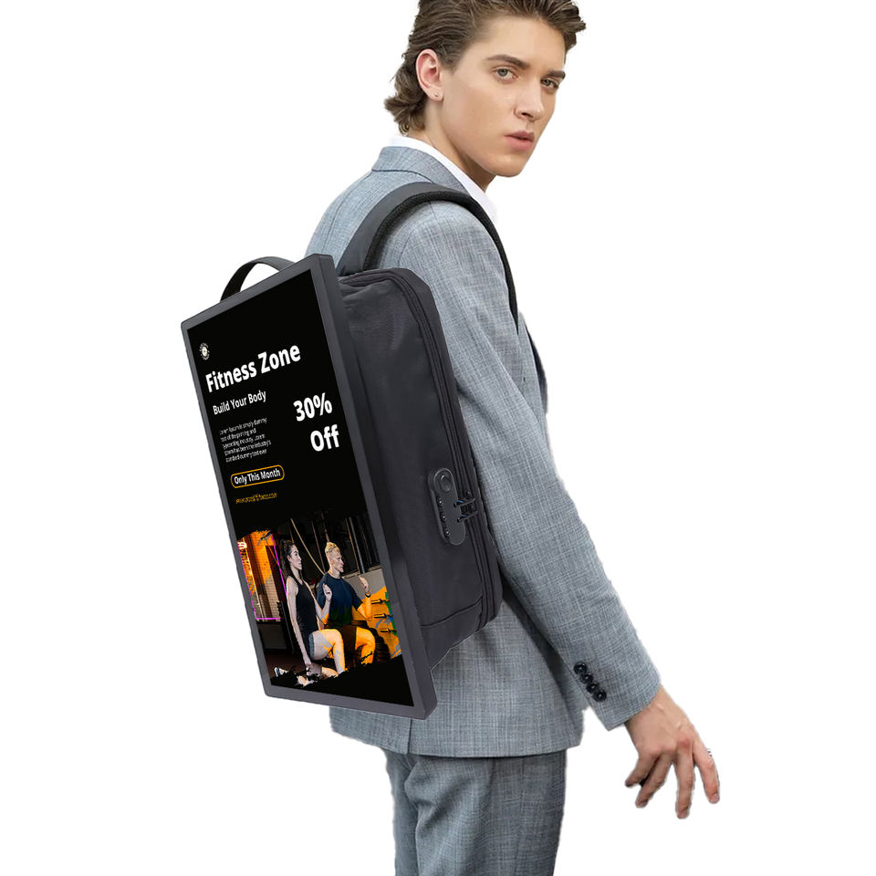 ขายดีที่สุด27นิ้วกระเป๋าเป้สะพายหลังโฆษณา LCD ป้ายโฆษณาดิจิตอลของมนุษย์