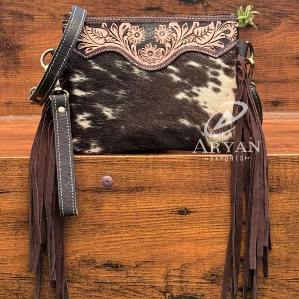 Large Capacity Trendy Hand Tooled Leather Crossbody Fringe Bag for Womens Genuine Leather Handbag Hair on Cowhide Shoulder Purse