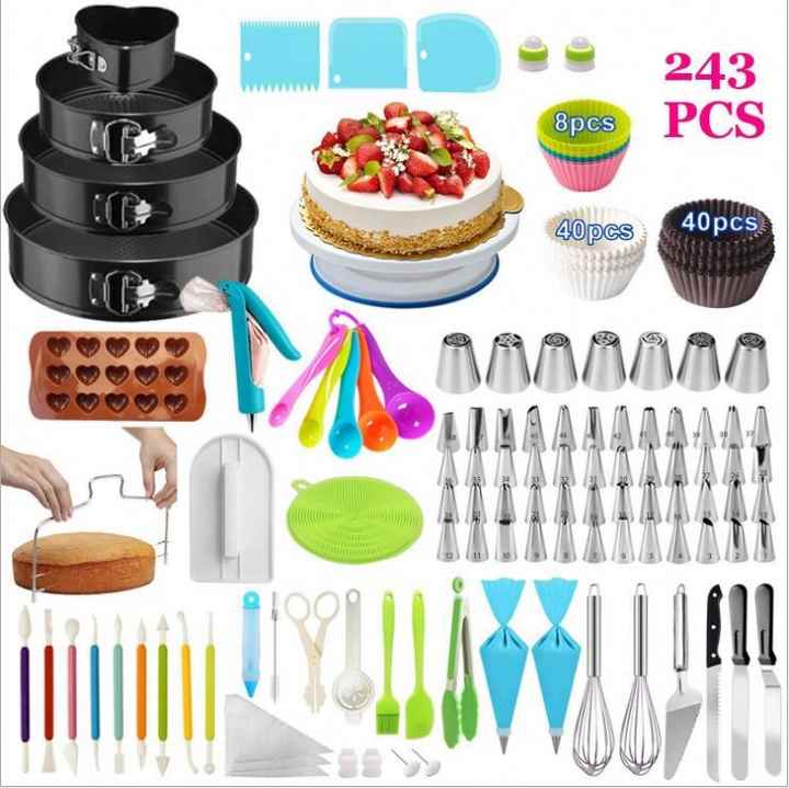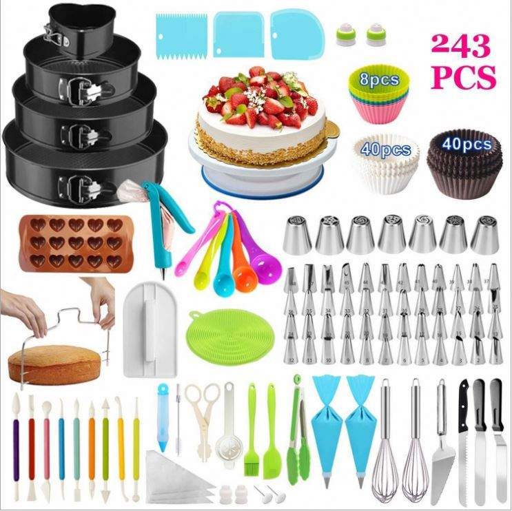 ชุดตกแต่งเค้กแบบเป็นมิตรกับสิ่งแวดล้อมขายดี พร้อมถาดอบและชั้นวาง จานหมุนพลาสติก 243 ชิ้น