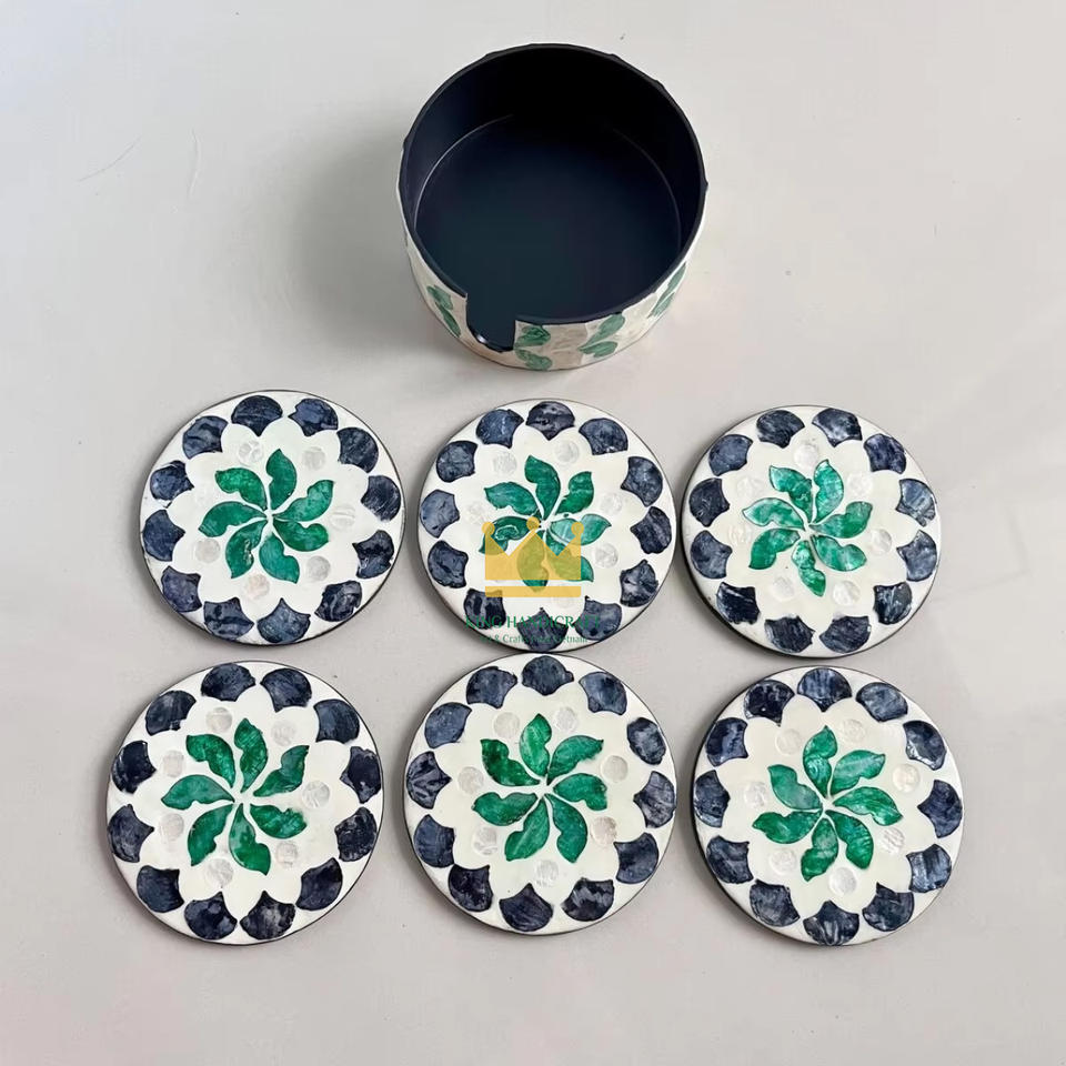 Best Seller High-End Rattan Drinkware Coasters Set Mother of Pearl Inlay Table Mats for Home Seashell Inlay Coaster for Parties