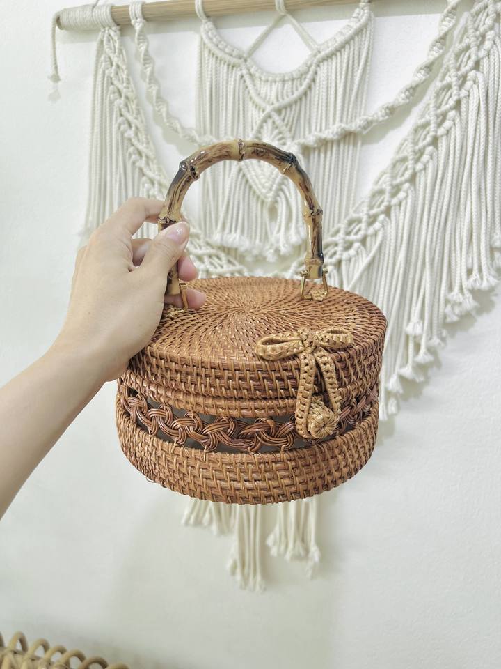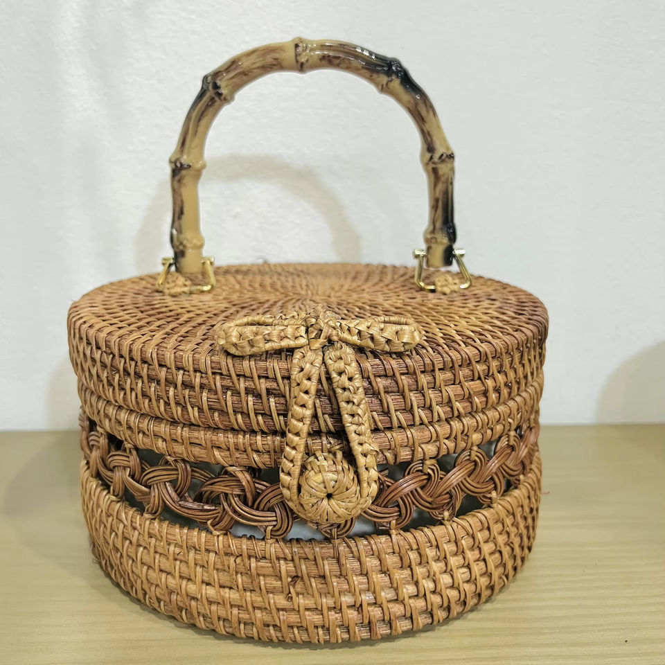 กระเป๋าคลัทช์หวายคุณภาพสูงสำหรับผู้หญิง ดีไซน์ทันสมัย ขายดี พร้อมหูจับไม้ไผ่ ปิดแบบเปิด ซับในผ้าฝ้ายลายโลโก้ เหมาะสำหรับไปทะเล