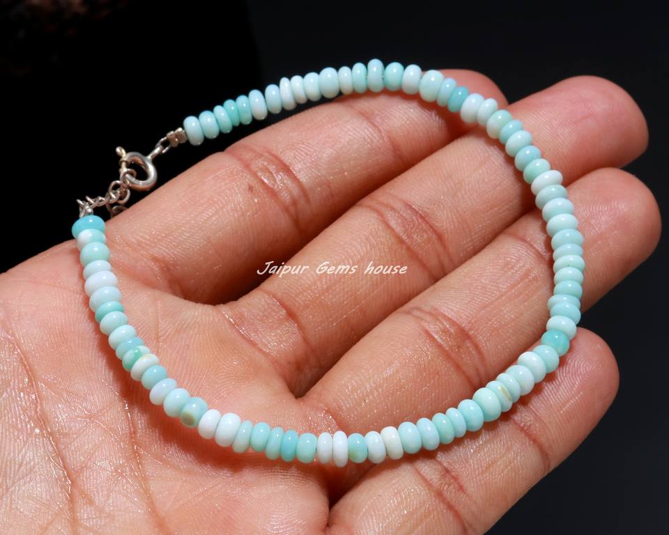 สร้อยข้อมือโอปอลเปรูสีฟ้าสวยตามธรรมชาติสร้อยข้อมือโอปอล6มม. กำไลข้อมือสีฟ้าเครื่องประดับฤดูร้อนเครื่องประดับลูกปัดเงินสเตอร์ลิง