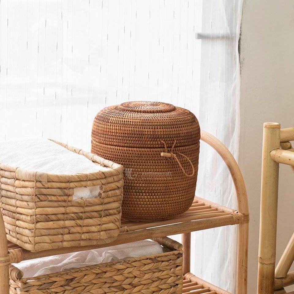กล่องเก็บของหวายธรรมชาติขายดี พร้อมฝาปิด ตะกร้าหวายทรงกลมทำมือ รับผลิตแบบ OEM ODM สำหรับชาและขนม