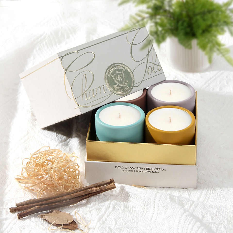 กล่องใส่เทียนสีขาวพร้อมด้านสีทองเคลือบ UV ผิวมันวาวเคลือบเงามันวาว
