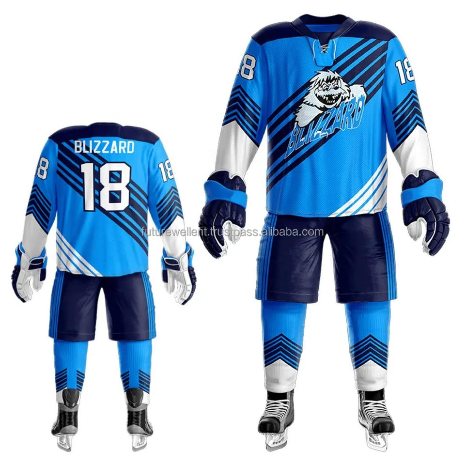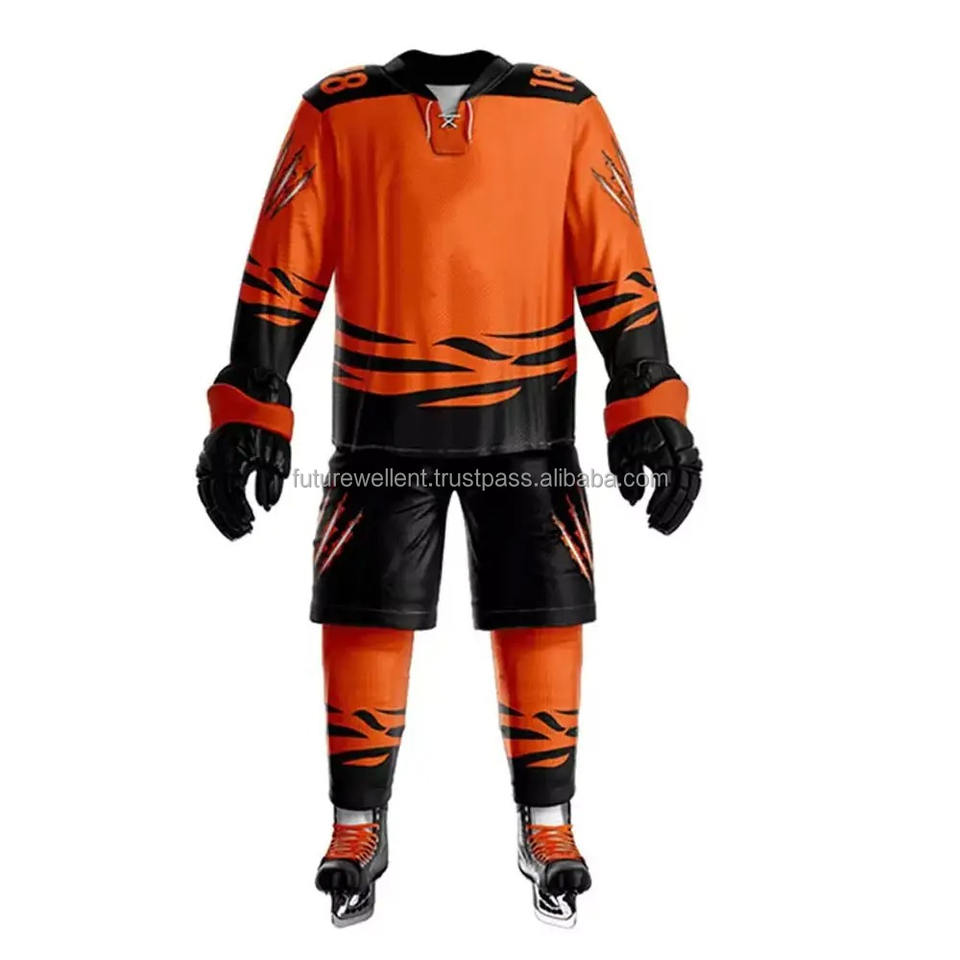 ชุดฮ็อกกี้น้ำแข็งผ้าโพลีเอสเตอร์สำหรับ100% พร้อมโลโก้และจำนวนแบบกำหนดเอง