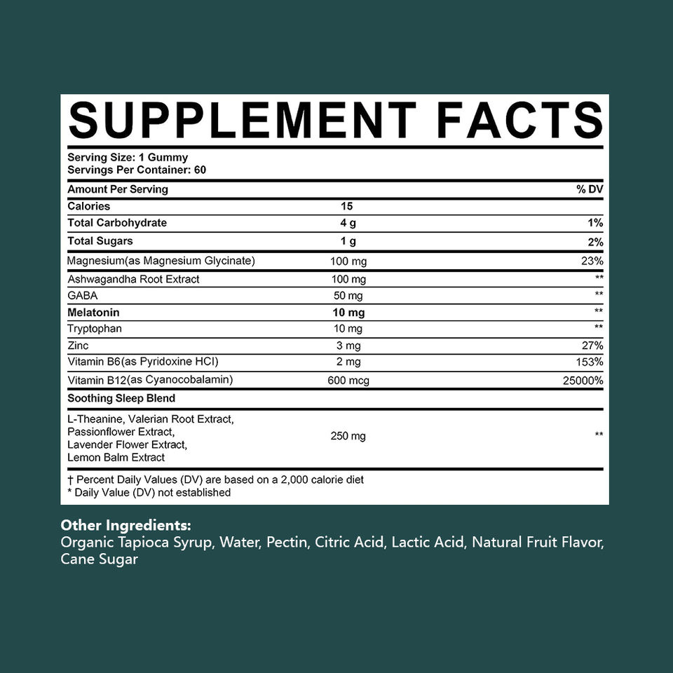 Melatonin, Magnesium, Ashwagandha Root Extract, GABA, Tryptophan, Zinc, Vitamin B6, Vitamin B12, Soothing Sleep BlendMain Ingredient